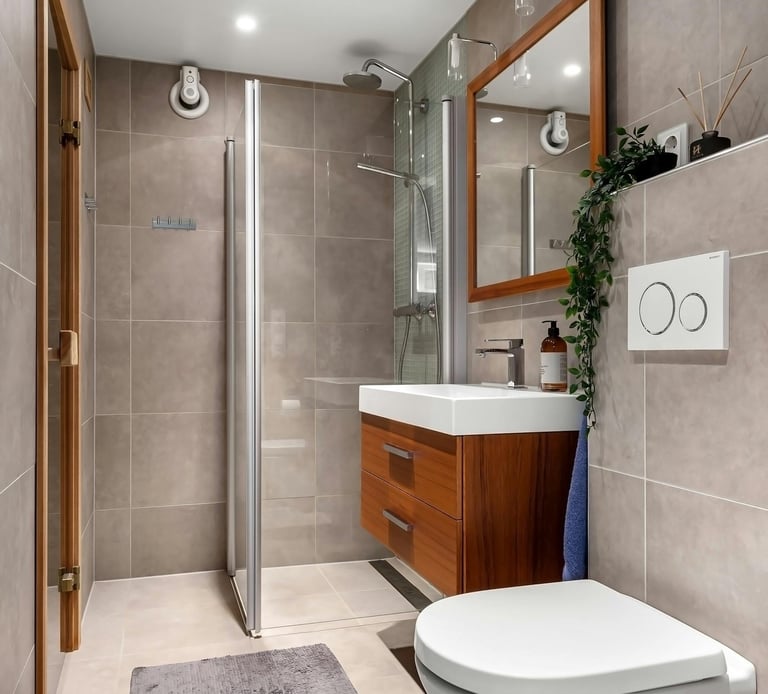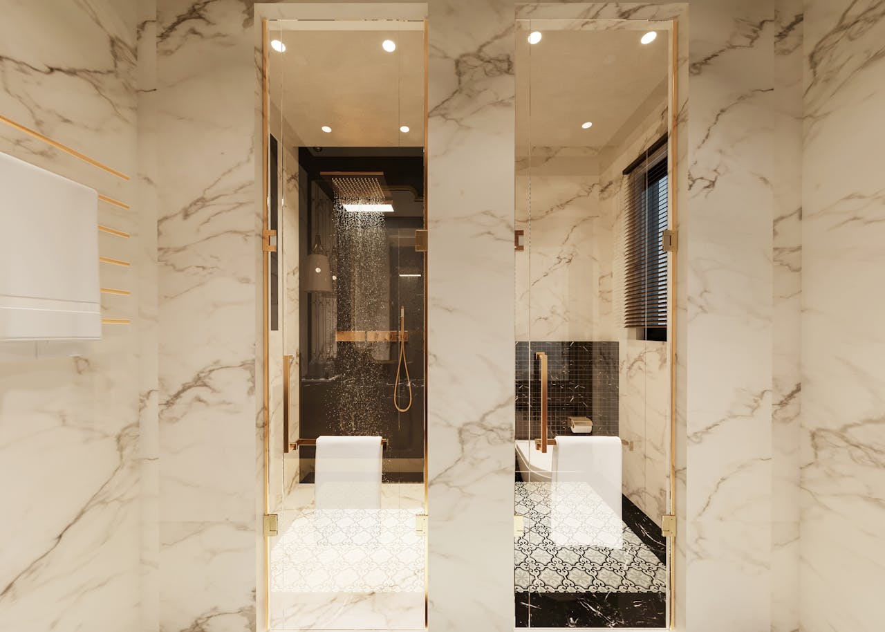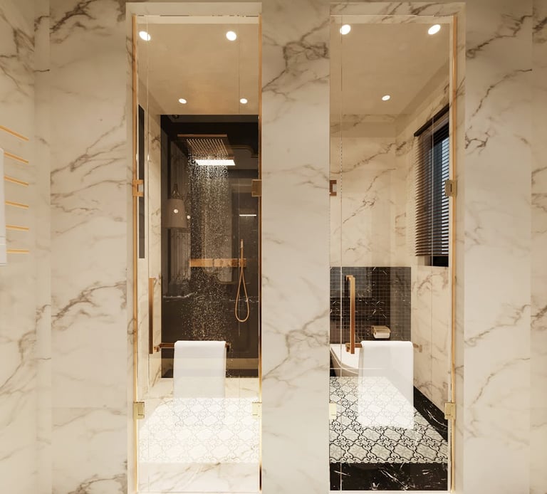 At Subarno Villa, bathing spaces are designed as private sanctuaries where elegance meets quiet indulgence. Crafted with a refined aesthetic, the bathrooms blend contemporary design with thoughtful functionality to create an atmosphere of calm sophistication. Sleek wall-hung commodes and glass partitions lend a clean, uncluttered visual appeal, while modern shoulder showers and premium diverters transform everyday routines into refreshing rituals. Complemented by stylish wash basins and carefully chosen fittings, every detail reflects a balance of comfort, practicality, and timeless luxury — turning the simple act of bathing into a moment of relaxation and renewal.