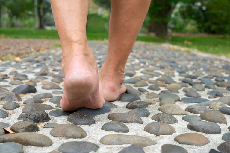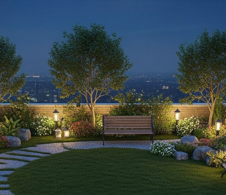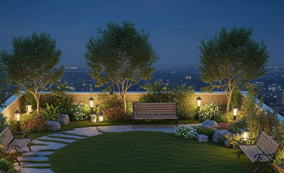 The terrace also integrates wellness into its design. A compact mini-gym encourages residents to stay active in a refreshing open-air environment, while a reflexology pathway offers a soothing barefoot walk that stimulates circulation and rejuvenates the senses. As evening approaches, subtle ambient lighting transforms the terrace into a softly illuminated retreat, and the faux-grass flooring provides a pleasant natural feel underfoot — together shaping a serene garden-like setting that invites relaxation at any hour.