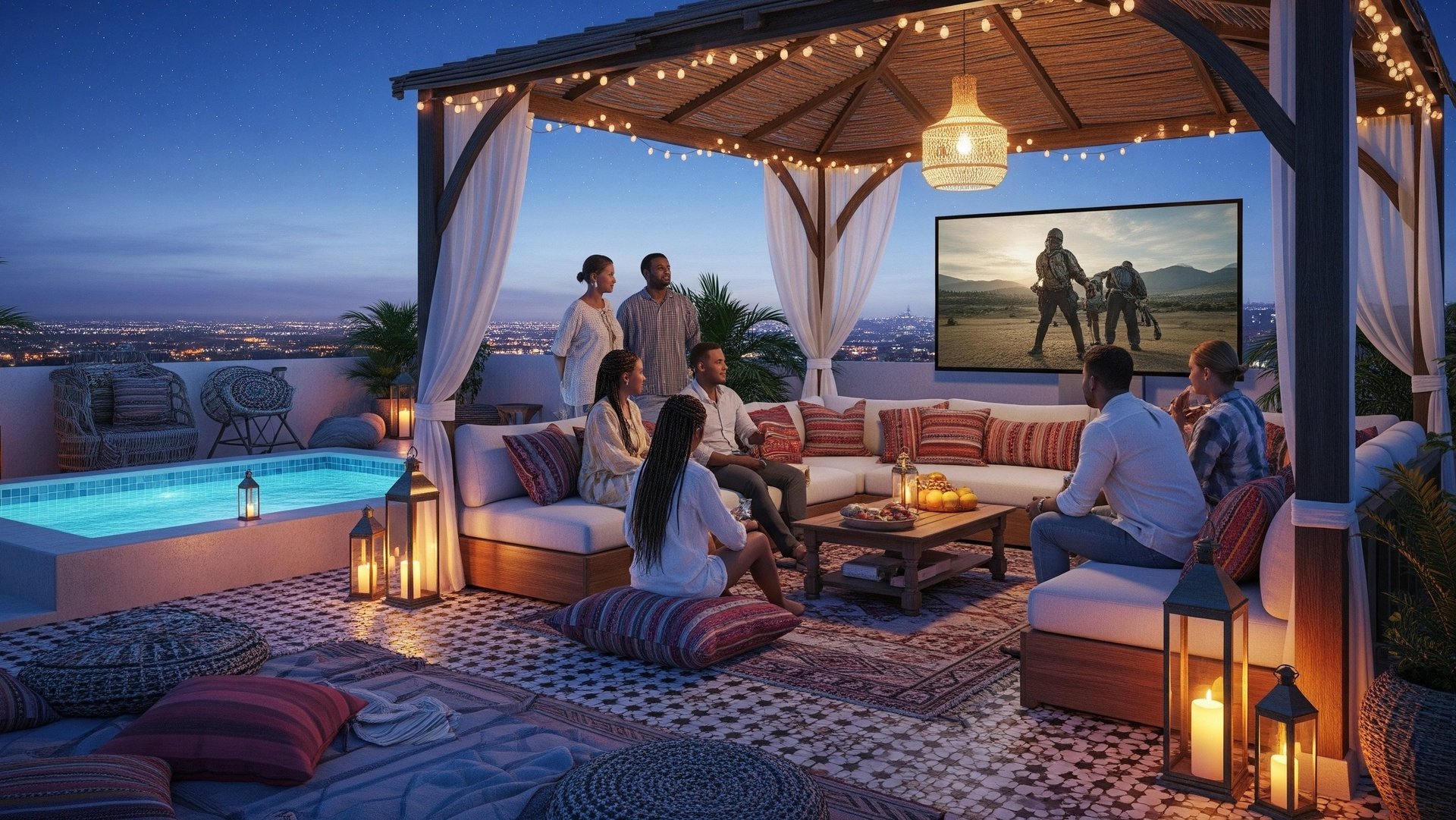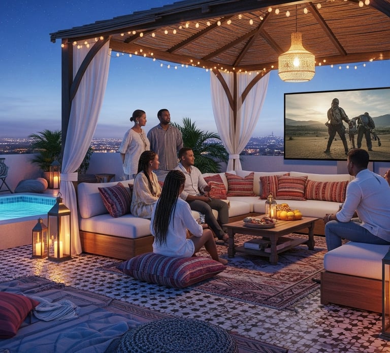 A refreshing plunge pool offers the perfect way to unwind beneath the open sky, while a thoughtfully designed outdoor audio-visual setup transforms evenings into movie nights or music lounges under the stars. Accented with distinctive Boho-inspired décor, the terrace brings together textures, colours, and warmth — creating an atmosphere that feels both stylish and joyfully relaxed.