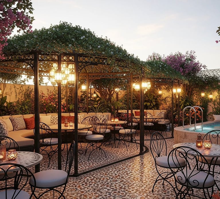 The Boho Terrace is a vibrant expression of relaxed sophistication — chic, inviting, and full of character. Designed for both gatherings and quiet moments, this unique space blends design, comfort, and personality into an atmosphere that feels effortlessly alive. At its heart stands a charming gazebo with elegant seating, creating a cozy corner for conversations and celebrations with loved ones.